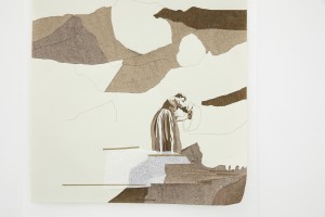 Time Team, Phil Harding, Waddon, Dorset, 2000 is a colour pencil drawing of a still from an archaeological programme titled Time Team. The image shows Phil Harding pointing to some stones embedded in the floor that don’t look like much but mark the wall of an iron age round house. This is typical of the programme, there is very little found in the way of gold, silver, jewels etc… and in watching you come to realise that the real interest lies in these seemingly empty patches of ground. Similarly to Daisy’s drawings, the programme had an interest in visualising the stratigraphy of time passing with a particular interest in the people and possessions that become truncated within their individual context and time.