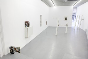 The ‘Corner Sculptures’ of Bastien Aubry & Dimitri Broquard structure the exhibition space. Made from melamine panels, recalling basic furniture kits and hand made ceramic brackets, the sculptures divert the materials from their usual functionality. Ceramics are no longer simply decorative pieces but are necessary to the structure of the sculptures. In the series ‘Cerebral Box’, painted and digitally transferred images are brought together in ceramic cereal boxes. The swiss duo mingles with humor modern and antique art references with cereal branding.