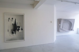 The two works on paper by Martijn Hendriks titled ‘Third’ and ‘Sixth’, both made in 2012, are part of a growing body of work that examines the notion of the ‘parallax object’, a term borrowed from philosopher Slavoj Žižek. Relating the notion of the parallax object to the emerging field of Object Oriented Ontology, Martijn Hendriks asks how an object can re-appear in new forms through its translation into text, its proximity to other objects, its documentation and circulation in the world. For ‘Third’ and ‘Sixth’, a photograph of a sculptural object has been repeatedly transformed through a number of different media and is presented as a proposition for two new sculptural objects.