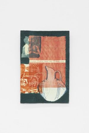 The compositions are deliberate and carefully constructed: photographs are mirrored, cropped, or subtly altered, and texts are embedded directly into the fabric.