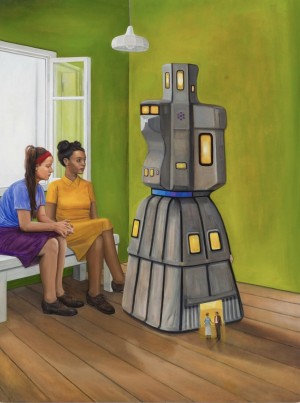 Spectacle and the scale of sculptures are other interests of Lewis In the paintings Who’s Denise Please? and Not Only, But Also we see the playful treatment of an architectural-scale sculpture seen in two distinct yet complementary contexts. In the former, the focus lies on two intrigued viewers examining the piece. In contrast, the latter portrays a commercial retail environment where the interaction between the people within the composition becomes the focal point, rather than the sculpture itself.